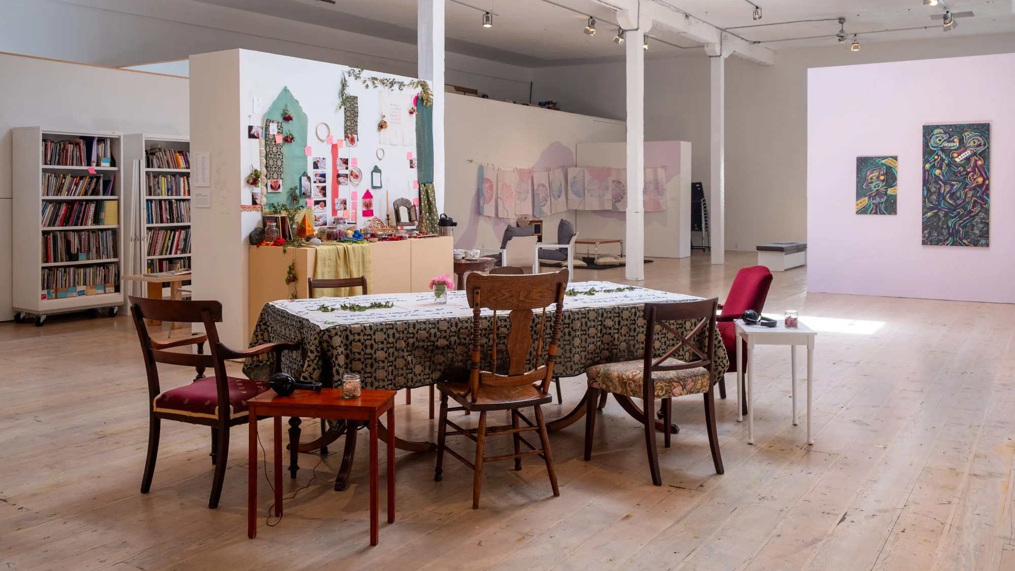 Cotton fabric, Banarasi silk tableskirt, embroidery floss, rose flowers, rose petals, rose branches, rose leaves, rose hips, table, chairs, side tables, headphones, audio recording (2 min 33 sec loop), photos, research notes, poetry and research books, brocade fabric, embroidery hoops, threaders, needles, scissors, incense, gulabdaan, mirror, gota, jars, vase, candles, pencil drawings, thermos, cups, tea.